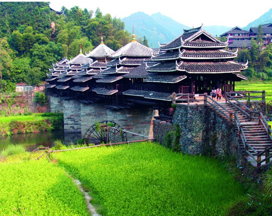 亦称花桥,是侗族的一种交通风俗。方便行人过往歇脚,也是迎宾场所。通常由桥、塔、亭组成。用木料筑成,靠凿榫衔接,风格独特,建筑技巧高超。桥面铺 板,两旁设置栏、长凳,形成长廊式走道。石桥墩上建塔、亭,有多层,每层檐角翘起,绘凤雕龙。顶有宝葫芦、千年鹤等吉祥物。