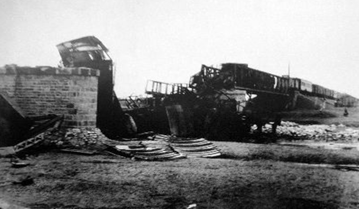 1931年9月18日夜,在日本关东军安排下,铁道“守备队”炸毁沈阳柳条湖附近日本修筑的南满铁路路轨,并栽赃嫁祸于中国军队。日军以此为借口,炮轰沈阳北大营,是为“九•一八”事变。图为1931年“九•一八”事变时被日军炸毁的南满铁路柳条湖段现场。