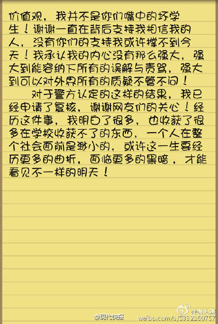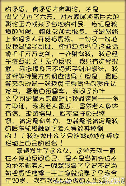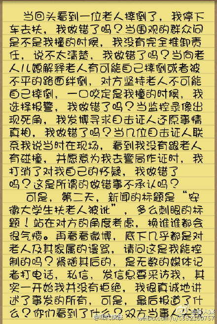 现代快报9月23日消息 9月8日起,淮南女大学生扶老人事件历经一波三折,女学生一方坚称没撞人,被讹了。淮南警方多方调查取证,认定这是一起交通事故,女大学生骑车经过老人时互有接触,女大学生负主要责任。今天中午,当事人@袁大宸更新了微博:
