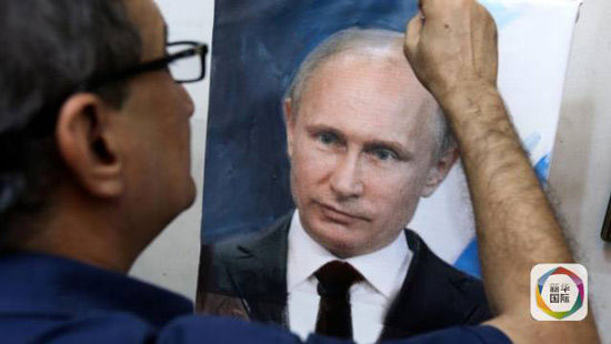 画家穆罕默德·卡里姆·尼哈亚是普京的拥趸。在位于巴格达的画室,他从互联网下载一幅普京照片,以此为参照创作了一幅普京肖像画,正在最后润色。