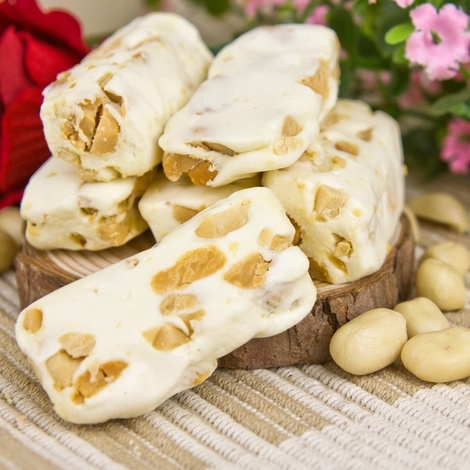 烤果仁和蜜糖制成的牛轧糖属于半软性糖果,牛轧糖好吃不粘牙,而且越嚼越香。