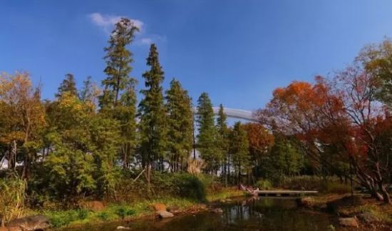 上海滨江森林公园公园东区河岸边那片北美枫香林,满树的红叶璀璨夺目,如火如荼,成为了公园里最撩人的秋色。中心主干道附近的杜鹃园中种植了很多的三角槭、枫香、鹅掌楸和鸡爪槭,也是赏红叶的好去处。西区生态林中,有很多条纵横交错的杉树林荫道,水杉、池杉和落羽杉的叶子开始转红,叶片飘落在地上,织成了公园最舒适的天然地毯。